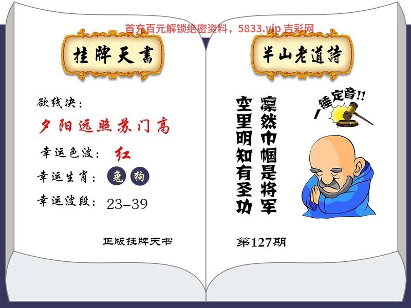 127期挂牌天书:开發00 空里明知有圣功,凛然巾帼是将军 解:空里明知有圣功,解阴肖鼠龙蛇马狗猪,凛然巾帼是将军,解君王生肖龙虎 六肖:鸡兔虎龙马鼠 12码:09.21.03.15.04.16.02.14.12.24.06.18 幸运波色:红波 幸运波段:23-39